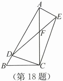 答案:18.$\frac{3\sqrt{7}}{2}$ 解析:因为$AD:BD=5:1$,$AB=12$,所以$AD=\frac{5}{6}AB=10$,$BD=\frac{1}{6}AB=2$。因为$\angle DCE=\angle ACB=90°$,所以$\angle DCE-\angle ACD=\angle ACB-\angle ACD$,所以$\angle ACE=\angle BCD$。因为$\angle BAC=\angle DEC=30°$,所以$\tan\angle BAC=\frac{BC}{AC}=\frac{\sqrt{3}}{3}$,$\tan\angle DEC=\frac{CD}{CE}=\frac{\sqrt{3}}{3}$,所以$\frac{AC}{BC}=\frac{CE}{CD}=\sqrt{3}$,所以$\triangle ACE∼\triangle BCD$,所以$\angle CAE=\angle B$,$\frac{AE}{BD}=\frac{CE}{CD}=\sqrt{3}$,所以$AE=2\sqrt{3}$。因为$\angle B=90°-\angle BAC=60°$,所以$\angle CAE=60°$,所以$\angle DAE=\angle BAC+\angle CAE=90°$,所以$DE=\sqrt{AD^2+AE^2}=4\sqrt{7}$,所以$CD=DE·\sin\angle DEC=2\sqrt{7}$,$CE=DE·\cos\angle DEC=2\sqrt{21}$。因为$\angle DAF=\angle CEF$,$\angle AFD=\angle EFC$,所以$\triangle DAF∼\triangle CEF$,所以$\frac{AF}{EF}=\frac{AD}{CE}=\frac{5\sqrt{21}}{21}$。因为$\angle CDF=90°-\angle DEC=60°$,所以$\angle CDF=\angle EAF$。又$\angle CFD=\angle EFA$,所以$\triangle CDF∼\triangle EAF$,所以$\frac{CF}{EF}=\frac{CD}{AE}=\frac{\sqrt{21}}{3}$,所以$\frac{AC}{EF}=\frac{AF}{EF}+\frac{CF}{EF}=\frac{4\sqrt{21}}{7}$。因为$AC=AB·\cos\angle BAC=6\sqrt{3}$,所以$EF=\frac{3\sqrt{7}}{2}$。