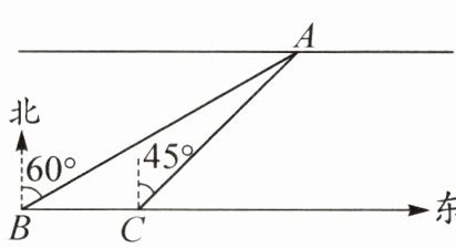 答案:24.过点$A$作$AD⊥ BC$,交$BC$的延长线于点$D$,则$\angle ADB=90°$。由题意,得$\angle BAD=60°$,$\angle CAD=45°$,$BC=1.5×40=60(\mathrm{m})$。设$AD=x\mathrm{ m}$,则$BD=AD·\tan\angle BAD=\sqrt{3}x\mathrm{ m}$,$CD=AD·\tan\angle CAD=x\mathrm{ m}$,所以$BC=BD-CD=(\sqrt{3}-1)x\mathrm{ m}$,所以$(\sqrt{3}-1)x=60$,解得$x=30(\sqrt{3}+1)\approx30×(1.732+1)\approx82$。故此段河面的宽度约为$82\mathrm{ m}$。