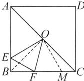 27. (9 分)如图,$ O $ 为正方形 $ ABCD $ 的中心,$ E $ 为边 $ AB $ 上一点,$ F $ 为边 $ BC $ 上一点,$\triangle EBF$ 的周长等于 $ BC $ 的长,连接 $ OA $,$ OC $,$ OE $,$ OF $.