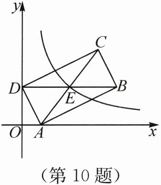 10. (2025·江苏扬州模拟)如图,在平面直角坐标系中,矩形ABCD的顶点A,D分别在x轴、y轴上,对角线BD//x轴,反比例函数$ y = \frac{k}{x} $(k>0,x>0)的图像经过矩形对角线的交点E.若点A的坐标为(2,0),点D的坐标为(0,4),则k的值为(