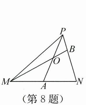 8. 亮点原创·如图,在△PMN中,PA是中线,点B在边PN上,且$ \frac{PB}{BN} = \frac{m}{n} $,MB交PA于点O,则$ \frac{OP}{OA} $的值为(