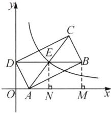 答案:10.B 解析:如图,过点B作BM⊥x轴于点M,过点E作EN⊥x轴于点N,则∠BMA=90°.因为四边形ABCD是矩形,所以∠BAD=90°,$DE=\frac{1}{2}BD$.因为BD//x轴,A(2,0),D(0,4),所以AO=2,BM=EN=OD=4.因为∠AOD=90°,所以$AD=\sqrt{AO^{2}+OD^{2}}=2\sqrt{5}$.因为∠ODA+∠OAD=90°,∠MAB+∠OAD=180° - ∠BAD=90°,所以∠ODA=∠MAB.又∠AOD=∠BMA,所以△AOD∽△BMA,所以$\frac{AD}{BA}=\frac{AO}{BM}$,即$\frac{2\sqrt{5}}{BA}=\frac{2}{4}$,所以$BA = 4\sqrt{5}$,所以$BD=\sqrt{BA^{2}+AD^{2}}=10$,所以$DE=\frac{1}{2}BD=5$,所以E(5,4).因为点E在反比例函数$y=\frac{k}{x}$的图像上,所以$4=\frac{k}{5}$,所以k = 20.