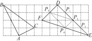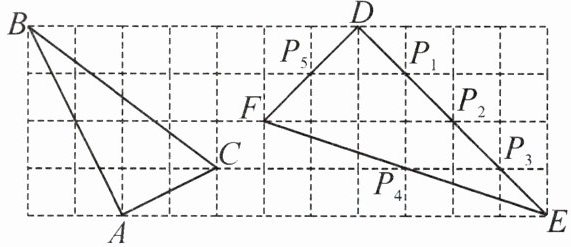 推理能力 如图,在边长为1的小正方形组成的网格中,△ABC和△DEF的顶点都在格点上,$P_{1},P_{2},P_{3},P_{4},P_{5}$是△DEF边上的5个格点.