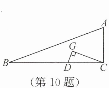 答案:10. D 解析:连接AG并延长交BC于点E,延长CG交AB于点F,连接EF. 因为G是△ABC的重心,所以AE,CF是△ABC的中线,所以E,F分别是BC,AB的中点,所以EF是△ABC的中位线,所以EF//AC,所以∠BEF = ∠ACB = 90°,所以∠CEF = 180° - ∠BEF = 90°. 因为DG⊥CG,所以∠CGD = 90°,所以∠CGD = ∠CEF. 又∠DCG = ∠FCE,所以△CDG∽△CFE,所以$\frac{CD}{CF}=\frac{CG}{CE}$. 因为BD = 5,CD = 3,所以BC = BD + CD = 8,所以$CE=\frac{1}{2}BC = 4$,所以$\frac{3}{CF}=\frac{CG}{4}$,所以$CF· CG = 12$. 因为$CF=\frac{3}{2}CG$,所以$\frac{3}{2}CG^{2}=12$,所以$CG = 2\sqrt{2}$,所以$\frac{CG}{BC}=\frac{\sqrt{2}}{4}$.