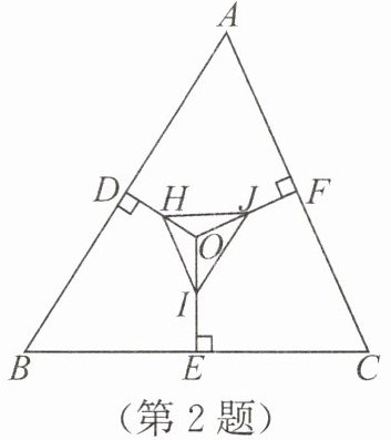 2. (3分) 如图, O是△ABC的外心, OD⊥AB, OE⊥BC, OF⊥AC, 垂足分别为D, E, F. H, I, J分别是OD, OE, OF的中点, 连接HI, IJ, HJ, 则△HIJ与△ABC面积的比是 (