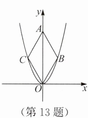 答案:13.$2\sqrt{3}$ 解析:连接BC交OA于点D.因为四边形OBAC为菱形,所以$BC⊥ OA$.因为$\angle ACO = 120^{\circ}$,所以$\angle OCD = 60^{\circ}$,所以$\angle COD = 30^{\circ}$,所以$OC = 2CD$,$OD=\sqrt{3}CD$.设$CD = t$,则$OD=\sqrt{3}t$,所以$C(-t,\sqrt{3}t)$.把点$C(-t,\sqrt{3}t)$代入$y=\sqrt{3}x^{2}$,得$\sqrt{3}t^{2}=\sqrt{3}t$,解得$t_{1}=0$(不合题意,舍去),$t_{2}=1$,所以$CD = 1$,$OD=\sqrt{3}$,所以$BC = 2CD = 2$,$OA = 2OD = 2\sqrt{3}$,所以菱形OBAC的面积为$\frac{1}{2}×2×2\sqrt{3}=2\sqrt{3}$.
