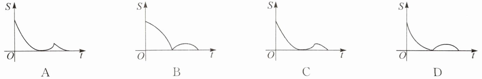 答案:D 解析:因为四边形ABCD是矩形,所以AD=BC=1,∠A=∠ABC=90°.因为∠ADB=60°,所以∠ABD=90°-∠ADB=30°,所以BD=2AD=2.因为1÷1=1(s),2÷2=1(s),1+1=2(s),所以t的取值范围为0≤t≤2,且当0≤t≤1时,点P在边AD上,点Q在对角线BD上;当1<t≤2时,点P在对角线BD上,点Q在边BC上.分类讨论如下:①当0≤t≤1时,AP=t,DQ=2t,则PD=AD-AP=1-t,BQ=BD-DQ=2-2t.过点P作PM⊥BD于点M,则∠PMD=90°,所以∠DPM=90°-∠ADB=30°,所以DM=$\frac{1}{2}$PD=$\frac{1}{2}$(1-t),所以PM=$\sqrt{PD^{2}-DM^{2}}$=$\frac{\sqrt{3}}{2}$(1-t),所以S=$\frac{1}{2}$BQ·PM=$\frac{\sqrt{3}}{2}$(t-1)²;②当1<t≤2时,PD=2(t-1),BQ=t-1,则BP=BD-PD=4-2t.过点P作PN⊥BC于点N,则∠PNB=∠PNC=90°,所以∠PNC=∠ABC,所以PN//AB,所以∠BPN=∠ABD=30°,所以BN=$\frac{1}{2}$BP=2-t,所以PN=$\sqrt{BP^{2}-BN^{2}}$=$\sqrt{3}$(2-t),所以S=$\frac{1}{2}$BQ·PN=$- \frac{\sqrt{3}}{2}$(t-$\frac{3}{2}$)²+$\frac{\sqrt{3}}{8}$.综上所述,S与t之间的函数表达式为S=$\begin{cases} \begin{array}{l} \frac{\sqrt{3}}{2}(t-1)^{2}(0\leq t\leq1), \\ -\frac{\sqrt{3}}{2}(t-\frac{3}{2})^{2}+\frac{\sqrt{3}}{8}(1<t\leq2). \end{array} \end{cases}$故能大致反映S与t之间函数关系的图像是选项D中的图像。