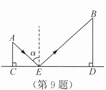 学科融合 如图,CD 是水平放置的一面镜子,光线从点 A 射出,经 CD 上一点 E 反射后照射到点 B. 若入射角为 $\alpha$,AC⊥CD,BD⊥CD,且 AC=3,BD=6,CD=10,则 ED 的长为