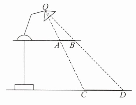 8. (8分) 如图,玻璃桌面与地面平行,桌面上有一盏台灯和一支铅笔,点光源 $O$ 与铅笔 $AB$ 所确定的平面垂直于桌面. 在灯光照射下,$AB$ 在地面上形成的影子为 $CD$(不计折射),$AB // CD$.