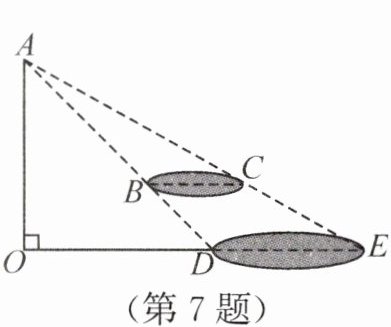 答案:7. $3.6$ 解析:延长$CB$交$OA$于点$F$,则$\angle AFB = \angle AOD = 90^{\circ}$.因为$OF = 0.75m$,$OA = 2m$,所以$FA = OA - OF = 1.25m$,所以$\frac{OA}{FA}=\frac{8}{5}$.因为$BC// DE$,所以$\triangle ADE∼\triangle ABC$.因为$OA$,$FA$分别是$\triangle ADE$和$\triangle ABC$的高,所以$\frac{DE}{BC}=\frac{OA}{FA}=\frac{8}{5}$,所以$DE = \frac{8}{5}BC$.因为$BC = 1m$,所以$DE = 1.6m$.因为$OD = 2m$,所以$OE = OD + DE = 3.6m$.