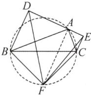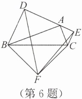 答案:6.$\frac{3 - \sqrt{5}}{2}$ 解析:如图,作$\triangle ABC$的外接圆,连接$AF$.因为$\angle BAC = 90°$,所以$BC$为$\triangle ABC$外接圆的直径.因为$\triangle ABD$,$\triangle BCF$,$\triangle CAE$均为等腰直角三角形,所以$\angle ADB = \angle BFC = \angle AEC = 90°$,$\angle BAD = \angle EAC = \angle FBC = \angle FCB = 45°$,所以点$F$在$\triangle ABC$的外接圆上,所以$\angle BAF = \angle FCB = 45°$,所以$\angle DAF = \angle BAD + \angle BAF = 90°$,所以$\angle ADB + \angle DAF = 180°$,$\angle DAF = \angle AEC$,所以$BD// AF// CE$,所以$S_{\triangle ABF} = S_{\triangle ADF}$,$S_{\triangle ACF} = S_{\triangle AEF}$,所以$S_{\triangle DEF} = S_{\triangle ADF} + S_{\triangle AEF} = S_{\triangle ABF} + S_{\triangle ACF} = S_{四边形ABFC} = S_{\triangle ABC} + S_{\triangle BCF}$.因为$S_{\triangle DEF}:S_{\triangle ABC} = 5:2$,所以$S_{\triangle DEF} = \frac{5}{2}S_{\triangle ABC}$,所以$\frac{5}{2}S_{\triangle ABC} = S_{\triangle ABC} + S_{\triangle BCF}$.设$AB = m$,$AC = n(m > n)$,则$S_{\triangle ABC} = \frac{1}{2}mn$,$BC^2 = AB^2 + AC^2 = m^2 + n^2$,所以$BF^2 + CF^2 = BC^2 = m^2 + n^2$.因为$BF = CF$,所以$2CF^2 = m^2 + n^2$,所以$S_{\triangle BCF} = \frac{1}{2}BF· CF = \frac{1}{2}CF^2 = \frac{1}{4}(m^2 + n^2)$,所以$\frac{1}{2}mn = \frac{1}{6}(m^2 + n^2)$,所以$n^2 - 3mn + m^2 = 0$,所以$n = \frac{3 - \sqrt{5}}{2}m(n = \frac{3 + \sqrt{5}}{2}m$不合题意,舍去$)$,所以$\tan\angle ABC = \frac{AC}{AB} = \frac{n}{m} = \frac{3 - \sqrt{5}}{2}$.