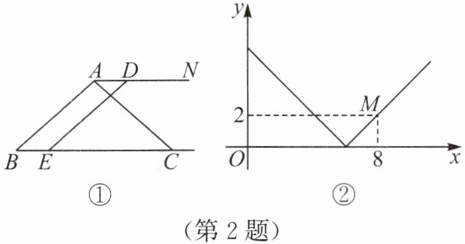 几何直观 如图①,在△ABC中,AB=AC=4,射线AN//BC,D为AN上一点,过点D作DE//AB,交射线BC于点E. 若CE的长y与AD的长x之间的关系可用图②中的函数图像表示,其中点M的坐标为(8,2),则∠B的正切值为(
