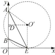 答案:3.A 解析:如图,当$\triangle ABE$的外接圆$\odot O'$与$x$轴相切于点$E$时,$\angle AEB$最大,则$O'E⊥ x$轴,所以$\angle O'EO = 90°$.过点$O'$作$O'D⊥ y$轴于点$D$,则$AD = BD = \frac{1}{2}AB$,$\angle O'DA = \angle O'DO = 90°$.又$\angle DOE = 90°$,所以四边形$ODO'E$是矩形,所以$O'E = OD$.因为$A(0,8)$,$B(0,2)$,所以$OA = 8$,$OB = 2$,所以$AB = OA - OB = 6$,所以$AD = BD = 3$,所以$O'A = O'E = OD = OB + BD = 5$,所以$O'D = \sqrt{O'A^2 - AD^2} = 4$.因为$\angle AEB = \angle AO'D$,所以$\tan\angle AEB = \tan\angle AO'D = \frac{AD}{O'D} = \frac{3}{4}$,所以$m$的最大值是$\frac{3}{4}$.又$m > 0$,所以$m$的取值范围是$0 < m \leq \frac{3}{4}$.