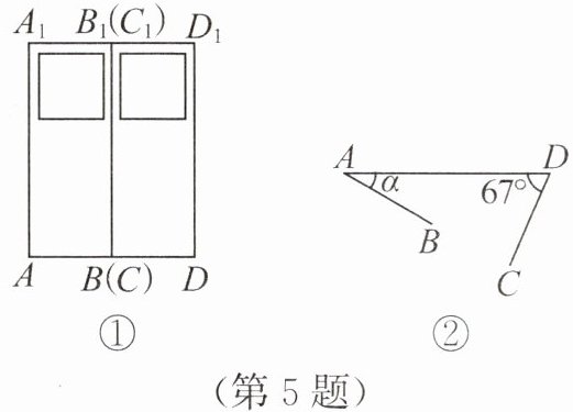 空间观念 如图①所示的是一种折叠门,已知门框的宽度AD=5m,两扇门的大小相同(即AB=CD),且AB+CD=AD,现将右边的门CDD₁C₁绕门轴DD₁向外面旋转67°,将左边的门ABB₁A₁绕门轴AA₁向外面旋转α(如图②),则当点B,C之间的距离最短时,tanα≈