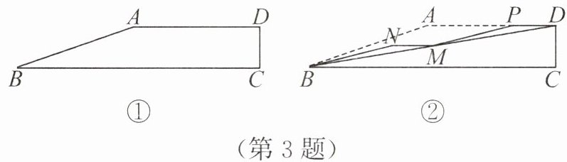 答案:3. ($\sqrt{35}$ - 2$\sqrt{2}$) 解析:如图①,过点A作AF⊥BC于点F,则∠AFB = ∠AFC = 90°. 因为楼梯AB的坡度为1 : 2$\sqrt{2}$,所以AF : BF = 1 : 2$\sqrt{2}$,所以BF = 2$\sqrt{2}$AF,所以AB = $\sqrt{AF^{2} + BF^{2}}$ = 3AF. 因为2AB = 18 m,所以AB = 9 m,所以3AF = 9 m,所以AF = 3 m,所以BF = 6$\sqrt{2}$ m. 因为AD // BC,所以∠C + ∠ADC = 180°. 因为∠C = 90°,所以∠ADC = 180° - ∠C = 90°,所以四边形AFCD为矩形,所以AD = CF,CD = AF = 3 m. 因为BD = 18 m,所以BC = $\sqrt{BD^{2} - CD^{2}}$ = 3$\sqrt{35}$ m,所以AD = CF = BC - BF = (3$\sqrt{35}$ - 6$\sqrt{2}$) m. 延长MN交AB于点E. 因为M为BD的中点,所以BM = $\frac{1}{2}$BD. 因为EM // AD,所以△BME ∽ △BDA,所以$\frac{BE}{AB}$ = $\frac{EM}{AD}$ = $\frac{BM}{BD}$ = $\frac{1}{2}$,所以BE = $\frac{1}{2}$AB = $\frac{9}{2}$ m,ME = $\frac{1}{2}$AD = $\frac{3\sqrt{35} - 6\sqrt{2}}{2}$ m,BM = $\frac{1}{2}$BD = 9 m. 如图②,过点E作EG // BM交BN的延长线于点G,则∠G = ∠MBN,∠GEN = ∠BMN,所以△EGN ∽ △MBN,所以$\frac{EN}{MN}$ = $\frac{GE}{BM}$. 因为BN是∠MBE的平分线,所以∠EBG = ∠MBN,所以∠G = ∠EBG,所以GE = BE = $\frac{9}{2}$ m,所以$\frac{EN}{MN}$ = $\frac{1}{2}$,所以MN = 2EN,所以MN = $\frac{2}{3}$EM = ($\sqrt{35}$ - 2$\sqrt{2}$) m.