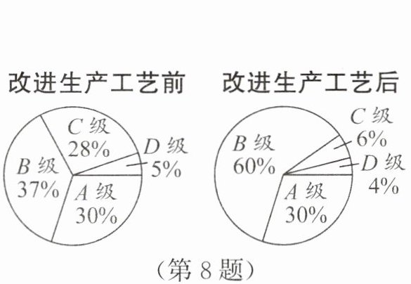 8. (2025·江苏苏州模拟·4分)上分点二 某公司生产的一种产品按照质量由高到低分为A,B,C,D四级.为了增加产量并提高质量,该公司改进了一次生产工艺,使得生产总量增加了一倍.为了解新生产工艺的效果,对改进生产工艺前、后的四级产品的占比情况进行了统计,绘制了如图所示的扇形统计图,则改进生产工艺后,下列推断合理的是 (