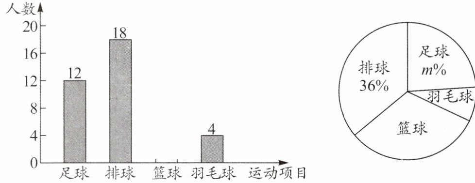 应用意识 国家卫生健康委员会宣布将2025年定为"体重管理年",并实施为期三年的体重管理行动.某校响应号召,计划组织全校学生开展系列体育活动,筹备足球、排球、篮球、羽毛球四个球类运动的体育社团,倡导学生全员参加.为了解学生对这四项球类运动的喜爱情况,随机抽取部分学生,对其进行了"我最喜爱的球类运动项目"问卷调查(每名学生在这四项球类运动项目中选择且只能选择一项),将这部分学生的问卷进行整理,依据样本数据绘制了如图所示两幅不完整的统计图.根据以上信息,解答下列问题: