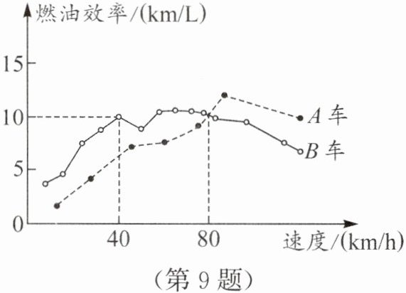 推理能力 汽车的"燃油效率"是指汽车每消耗1 L汽油最多可行驶的公里数.如图描述了A,B两辆汽车在不同速度下的燃油效率情况,给出下面4个推断:① 消耗1 L汽油,A车最多可行驶5 km;② B车以40 km/h的速度行驶1 h,最少消耗4 L汽油;③ 对于A车而言,行驶速度越快越省油;④ 某城市机动车最高限速80 km/h,相同条件下,在该市驾驶B车比驾驶A车更省油.其中合理的是
