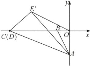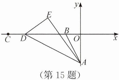 答案:15. $\frac{8\sqrt{5}}{5}$ 解析:连接$OE$.因为$\triangle AED \backsim \triangle AOB$,所以$\angle EAD=\angle OAB,\angle AED=\angle AOB=90°$,所以$A,O,E,D$四点共圆,所以$\angle EOD=\angle EAD=\angle OAB$,即$\angle EOD$为定值,所以点$E$的运动路径为一条线段.当点$D$与点$B$重合时,点$E$与点$O$重合.如图,当点$D$与点$C$重合时,设点$E$运动到点$E'$处,则$OE'$即为点$E$运动的路径.因为$\triangle AE'C \backsim \triangle AOB$,所以$\frac{AE'}{AO}=\frac{AC}{AB},\angle E'AC=\angle OAB$,所以$\frac{AB}{AO}=\frac{AC}{AE'}$,$\angle E'AC+\angle E'AB=\angle OAB+\angle E'AB$,即$\angle BAC=\angle OAE'$,所以$\triangle BAC \backsim \triangle OAE'$,所以$\frac{BC}{OE'}=\frac{BA}{OA}$.因为$A(0,-2),B(-1,0),C(-5,0)$,所以$OA=2,OB=1,OC=5$,所以$BC=OC-OB=4,BA=\sqrt{OA^2+OB^2}=\sqrt{5}$,所以$\frac{4}{OE'}=\frac{\sqrt{5}}{2}$,所以$OE'=\frac{8\sqrt{5}}{5}$,即点$E$运动的路径长为$\frac{8\sqrt{5}}{5}$.