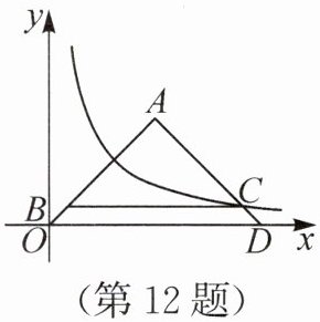 12. (2025·江苏扬州模拟·4分)如图,在平面直角坐标系中,O是原点,△AOD的顶点D在x轴的正半轴上,∠A=90°,AO=AD,C为反比例函数y=$\frac{k}{x}$(k>0,x>0)的图像与边AD的交点,点B在边AO上,且BC//OD.若$\frac{BC}{OB + CD}=\frac{5\sqrt{2}}{2}$,△ABC的面积为5,则k=