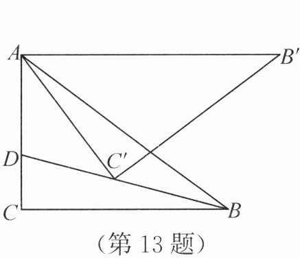 答案:13. $\frac{3}{11}$ 解析:过点$C'$分别作$C'E⊥ AC$于点$E,C'F⊥ BC$于点$F$,则$\angle AEC'=\angle CEC'=\angle BFC'=\angle CFC'=90°$.又$\angle C=90°$,所以四边形$CEC'F$是矩形,所以$CE=C'F,C'E=CF$.由旋转的性质,得$AC'=AC=6,\angle B'AB=\angle C'AC$.因为$AB'// BC$,所以$\angle B'AB=\angle ABC$,所以$\angle C'AC=\angle ABC$,所以$\tan\angle C'AC=\tan\angle ABC$,所以$\frac{C'E}{AE}=\frac{AC}{BC}$.因为$BC=8$,所以$\frac{C'E}{AE}=\frac{3}{4}$,所以$C'E=\frac{3}{4}AE$,所以$AC'=\sqrt{AE^2+C'E^2}=\frac{5}{4}AE$,所以$\frac{5}{4}AE=6$,所以$AE=\frac{24}{5}$,所以$C'F=CE=AC-AE=\frac{6}{5}$,$CF=C'E=\frac{18}{5}$,所以$BF=BC-CF=\frac{22}{5}$,所以$\tan\angle CBD=\frac{C'F}{BF}=\frac{3}{11}$.