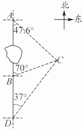答案:2.过点C作CE⊥AB于点E,则∠AEC = ∠DEC = 90°.设BE = x海里.因为BD = 32海里,所以DE = BE + BD = (x + 32)海里.因为∠CBE = 70°,所以CE = BE·tan∠CBE≈2.75x海里.因为∠CDE = 37°,所以CE = DE·tan∠CDE≈0.75(x + 32)海里,所以2.75x = 0.75(x + 32),解得x = 12,所以BE = 12海里,CE = 33海里.因为∠CAE = 47.6°,所以AE = $\frac{CE}{\tan\angle CAE}$≈30海里,所以AB = AE + BE = 42海里.故海岛A,B之间的距离约是42海里.