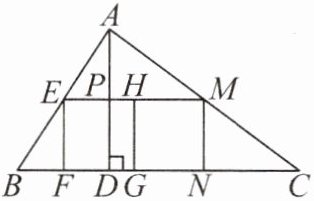 答案:【思路分析】因为四边形EFGH和四边形HGNM均为正方形,所以EF = EH = HG = HM,EM//BC,所以△AEM∽△ABC。因为AD⊥BC,所以AP⊥EM,所以AP,AD分别是△AEM和△ABC的对应高,所以$\frac{AP}{AD} = \frac{EM}{BC}$。设PD = EF = EH = HM = x,则EM = EH + HM = 2x。因为AD = 5,所以AP = AD - PD = 5 - x。因为BC = 10,所以$\frac{5 - x}{5} = \frac{2x}{10}$,解得x = $\frac{5}{2}$,所以EM = 5,所以$\frac{S_{\triangle AEM}}{S_{\triangle ABC}} = (\frac{EM}{BC})^2 = \frac{1}{4}$,所以S_{\triangle ABC} = 4S_{\triangle AEM},所以S_{四边形BCME} = S_{\triangle ABC} - S_{\triangle AEM} = 3S_{\triangle AEM},所以△AEM与四边形BCME面积的比为1 : 3。