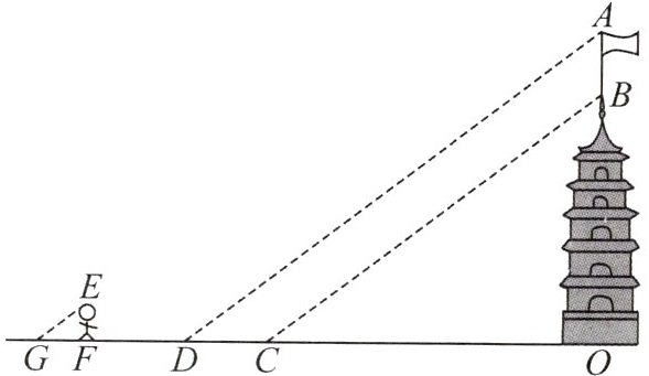 答案:【思路分析】在阳光下, 同一时刻, 物高与影长成正比. 已知小明的身高与影长, 则由 $ OA,OB $ 的影长可求 $ OA,OB $ 的高, 根据旗杆 $ AB $ 的高 $ = OA - OB $ 可求得答案.
