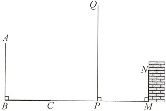 答案:过点N作ND⊥PQ于点D,则∠PDN = 90°。因为MN⊥PM,PQ⊥PM,所以∠MPQ = ∠PMN = 90°,所以四边形PMND为矩形,所以DP = MN = 1.1 m,DN = PM = 1.8 m。由题意,得$\frac{DQ}{DN} = \frac{AB}{BC}$。因为AB = 2 m,BC = 1.6 m,所以DQ = 2.25 m,所以PQ = DP + DQ = 3.35 m。故竹竿PQ的高为3.35 m。