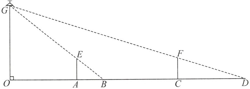 答案:【思路分析】因为 $ AE // OG $, 所以 $ \triangle ABE ∼ \triangle OBG $, 所以 $\frac{AB}{OB} = \frac{AE}{OG}$. 设 $ AB = x $ m. 因为 $ OA = 5 $ m, 所以 $ OB = OA + AB = (5 + x) $ m. 因为 $ AE = 1.6 $ m, $ OG = 5.6 $ m, 所以 $\frac{x}{5 + x} = \frac{1.6}{5.6}$, 解得 $ x = 2 $. 经检验, $ x = 2 $ 是原分式方程的解且符合题意, 则 $ AB = 2 $ m. 因为 $ CF // OG $, 所以 $ \triangle CDF ∼ \triangle ODG $, 所以 $\frac{CD}{OD} = \frac{CF}{OG}$. 设 $ AC = y $ m. 因为 $ CD = 2 + 3 = 5 $(m), 所以 $ OD = OA + AC + CD = (y + 10) $ m, 所以 $\frac{5}{y + 10} = \frac{1.6}{5.6}$, 解得 $ y = 7.5 $. 经检验, $ y = 7.5 $ 是原分式方程的解且符合题意, 则 $ AC = 7.5 $ m. 故小方行走的路程是 $ 7.5 $ m.