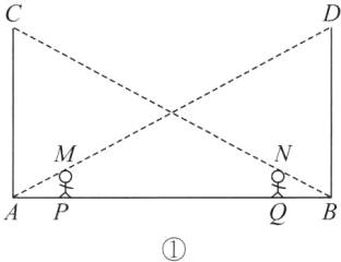 答案:(1) 如图①,因为PM//BD,所以△APM∽△ABD,所以$\frac{AP}{AB} = \frac{PM}{BD}$。设AP = BQ = x m。因为PQ = 12 m,所以AB = AP + PQ + BQ = (2x + 12) m。因为PM = 1.6 m,BD = 9.6 m,所以$\frac{x}{2x + 12} = \frac{1.6}{9.6}$,解得x = 3。经检验,x = 3是原分式方程的解且符合题意,则AB = 18 m。故两个路灯之间的距离为18 m。