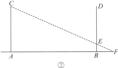 (2) 如图②,当小华走到路灯B的底部时,假设他在路灯A下的影子为BF。因为BE//AC,所以△FBE∽△FAC,所以$\frac{BF}{AF} = \frac{BE}{AC}$。设BF = y m。因为AB = 18 m,所以AF = AB + BF = (y + 18) m。因为BE = 1.6 m,AC = 9.6 m,所以$\frac{y}{y + 18} = \frac{1.6}{9.6}$,解得y = 3.6。经检验,y = 3.6是原分式方程的解且符合题意,则BF = 3.6 m。故当小华走到路灯B的底部时,他在路灯A下的影长是3.6 m。