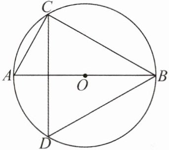 答案:【思路分析】因为AB是⊙O的直径,所以∠ACB=90°.因为∠CAB,∠CDB均是$\overset{\LARGE{\frown}}{BC}$所对的圆周角,所以∠CAB=∠CDB=60°,所以∠ABC=90°−∠CAB=30°,所以cos∠ABC=cos30°=$\dfrac{\sqrt{3}}{2}$.