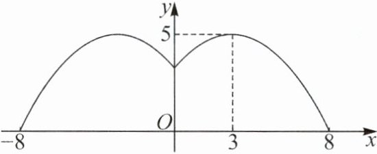 某游乐园有一个直径为 16 m 的圆形喷水池, 喷水池的周边有一圈喷水头, 喷出的水柱为抛物线形, 在距水池中心 3 m 处达到最高, 高度为 5 m, 且各方向喷出的水柱恰好在喷水池中心的装饰物处汇合. 如图, 以喷水池中心为原点, 水平方向为 $ x $ 轴, 建立平面直角坐标系 (单位长度为 1 m). 王师傅在喷水池内维修设备期间, 喷水管意外喷水, 为了不被淋湿, 身高 1.8 m 的王师傅站立时必须在离水池中心
