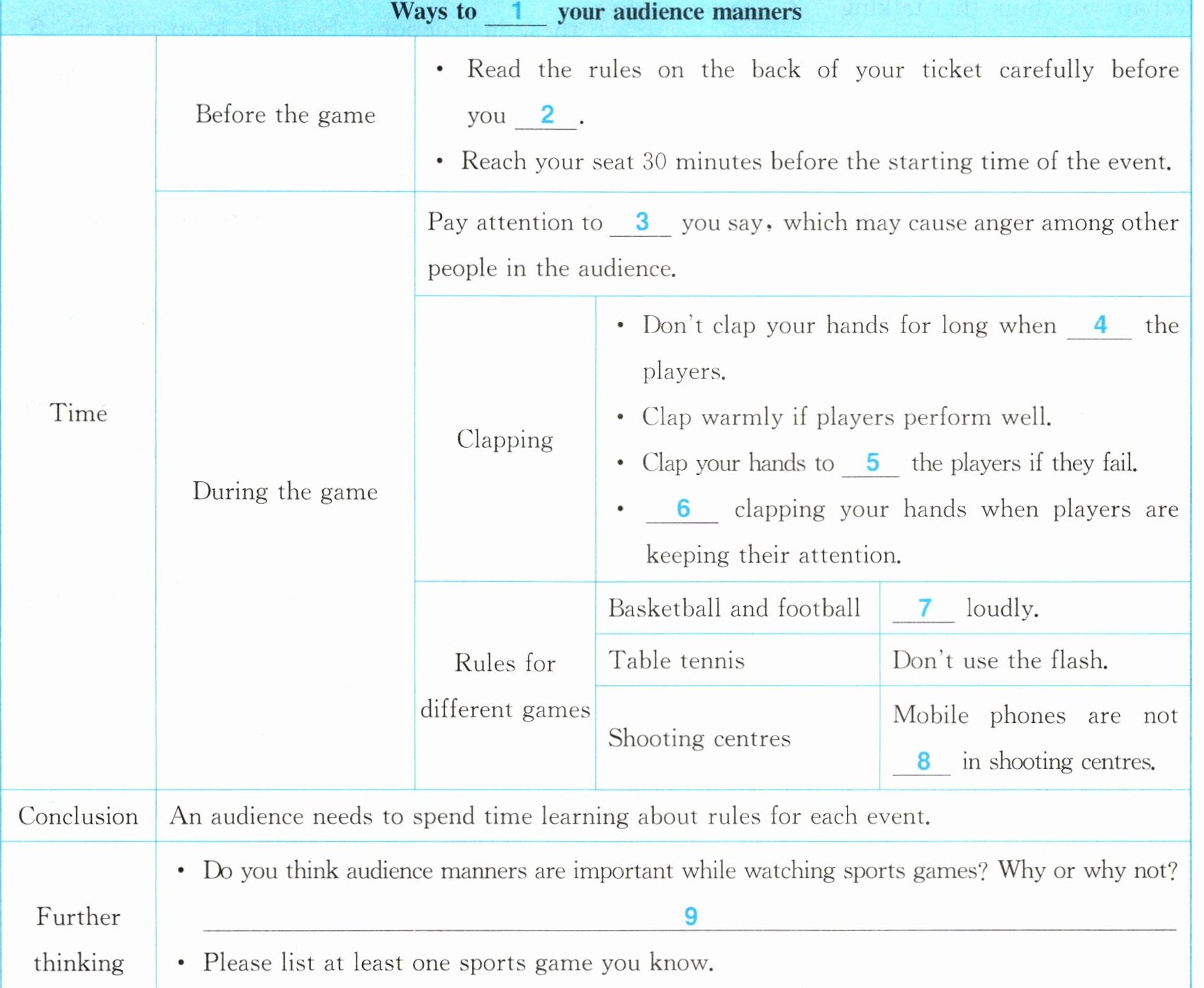 Different sports have different rules for the audience. Enjoy artistic gymnastics in silence. But lots of cheering can really help basketball and football players. When you watch table tennis games,you can’t use your flash photography. Don’t use mobile phones in shooting centres,either.