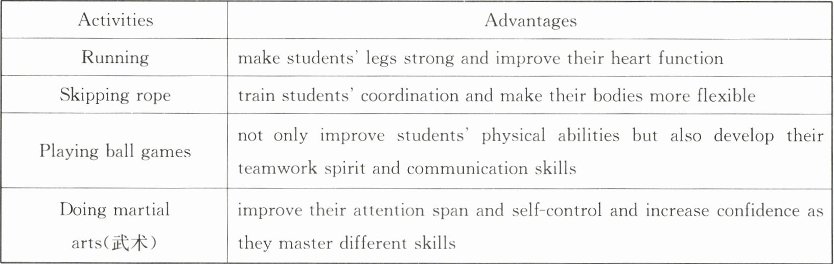 As the old saying goes, "All work and no play makes Jack a dull boy." Jiangsu Education Department emphasizes the importance of students' physical health and advises the implementation(实施) of the big break exercise system. It asks schools to arrange 30-minute big break sports activities regularly every day, aiming to make sure that students have enough time for exercise. Schools should design different activities to have the students train their bodies exactly. The following can be the choices.