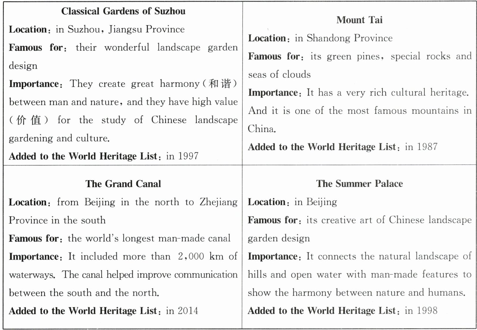 Many mountains, such as Mount Tai, Mount Emei, Mount Hua, are very famous. People like to go to Mount Tai to