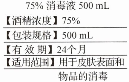 10. 酒精消毒液是水和酒精的混合液体,如图是某品牌酒精消毒液的说明书,“75%”是指 100 mL 的消毒液含有 75 mL 酒精. 配制这瓶消毒液需要酒精的体积是