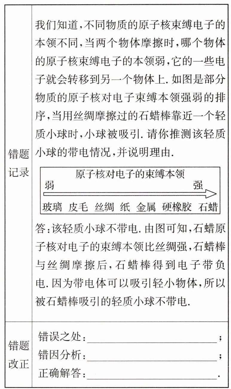 答案:12. 该轻质小球不带电 没有考虑到异种电荷相互吸引,错误地认为带电体只可以吸引轻小物体 由图可知,石蜡原子核对电子的束缚本领比丝绸强,石蜡棒与丝绸摩擦后,石蜡棒得到电子带负电.因为带电体可以吸引轻小物体且异种电荷相互吸引,所以被石蜡棒吸引的轻质小球可能不带电或带正电