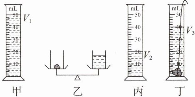 (3) 将小石头放入图丙量筒内,记下量筒内水的体积 V₃,如图丁所示.
