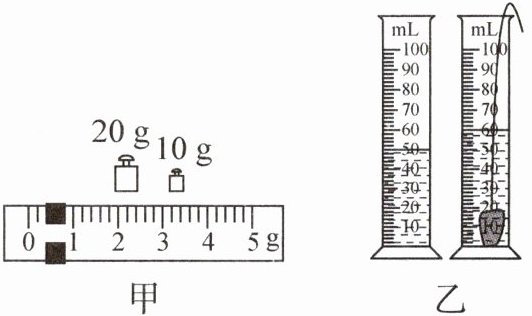 (2) 先调节天平平衡,再将两个相同的烧杯放在天平左右盘上,将小石头轻轻放入左盘烧杯中,将图甲量筒内的水缓慢向右盘烧杯中倒,直至天平平衡,