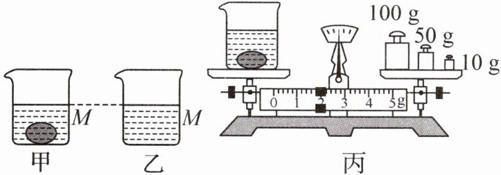 (2) 如图甲,把鹅卵石轻轻放入烧杯中,往烧杯中倒入适量水,用油性笔在烧杯壁上记下此时水面位置 M,然后放在天平左盘,如图丙所示,测出质量为