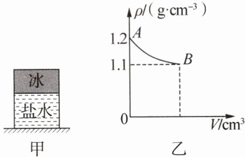 3. (2025·江苏无锡期中)如图所示,柱形容器内的盐水和冰刚好将容器装满,随着温度升高,冰会开始熔化(图乙中 $ A $ 点),到完全熔化成水(图乙中 $ B $ 点),盐水的密度随冰熔化的体积变化的关系如图乙所示。晓晨发现冰完全熔化后液面下降,若加入 $ 20\ \mathrm{g} $ 的水,液面刚好与容器口相平。不考虑水的蒸发,且冰熔化成水与盐水混合后总体积不变,则冰完全熔化成水时减少的体积为