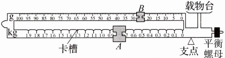(3)若用调节好的台秤称量一个邮包的质量,秤杆水平平衡后,秤锤 $ A $、$ B $ 所处的位置如图所示,则该邮包的质量为