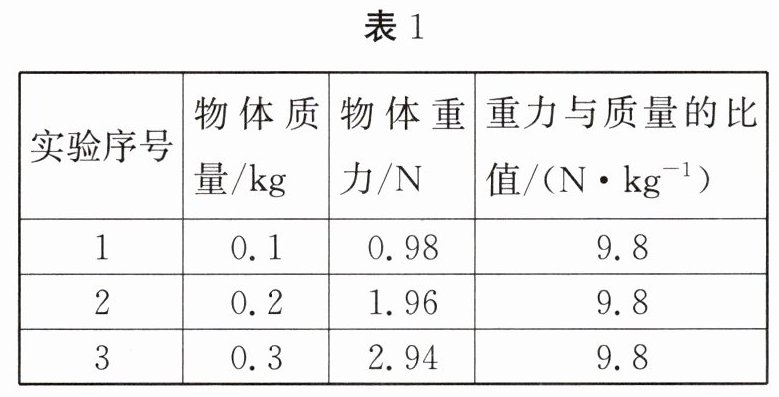 科学探究 小明在探究物体所受重力大小与物体质量的关系时,实验记录如表1。