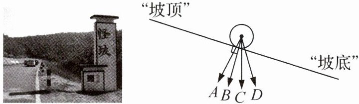 (选填“竖直向下”或“竖直向上”)。中国很多地方有“怪坡”景点,在“怪坡”上,“车倒爬,水倒流”。科学家实地测量某一怪坡发现,怪坡的“坡顶”比“坡底”还要低,但受周围参照物的影响产生了错觉,如图所示,由此可见,科学测量才能弄清真相。车轮在该怪坡上受到重力的方向可能为