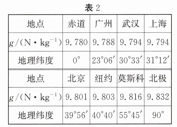 (3)在一般情况下 $ g $ 为定值,但经过科学家的精确测量,$ g $ 值仍有差异。观察表2中提供的数据,回答下列问题。