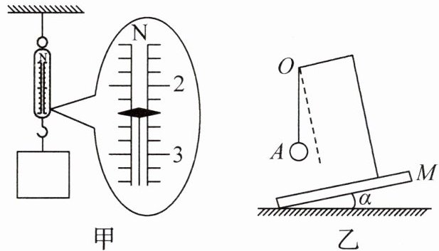 (3)如图乙所示是同学们在老师指导下探究重力方向的实验装置。将该装置放在水平桌面上后,逐渐改变木板 $ M $ 与桌面的夹角 $ \alpha $,会观察到悬线 $ OA $ 的方向