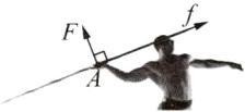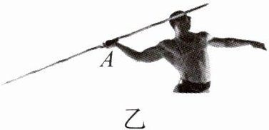 (2) (2025·山东威海)如图乙所示,运动员握住标枪静止不动,支撑标枪的手掌面(支撑点为$A$)与标枪平行,请在$A$点画出标枪受到手掌的支持力和摩擦力。