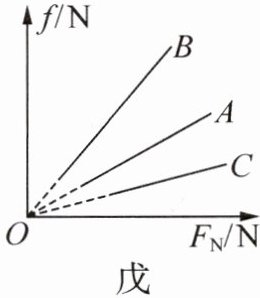 (4) 小华在图乙的基础上继续进行实验,他通过改变木块上砝码的个数改变木块对木板的压力,记录多组滑动摩擦力 $ f $ 及压力 $ F_{\mathrm{N}} $ 的大小,作出摩擦力 $ f $ 随压力 $ F_{\mathrm{N}} $ 的变化图像,如图戊中 $ A $ 所示,则滑动摩擦力 $ f $ 与压力 $ F_{\mathrm{N}} $ 成